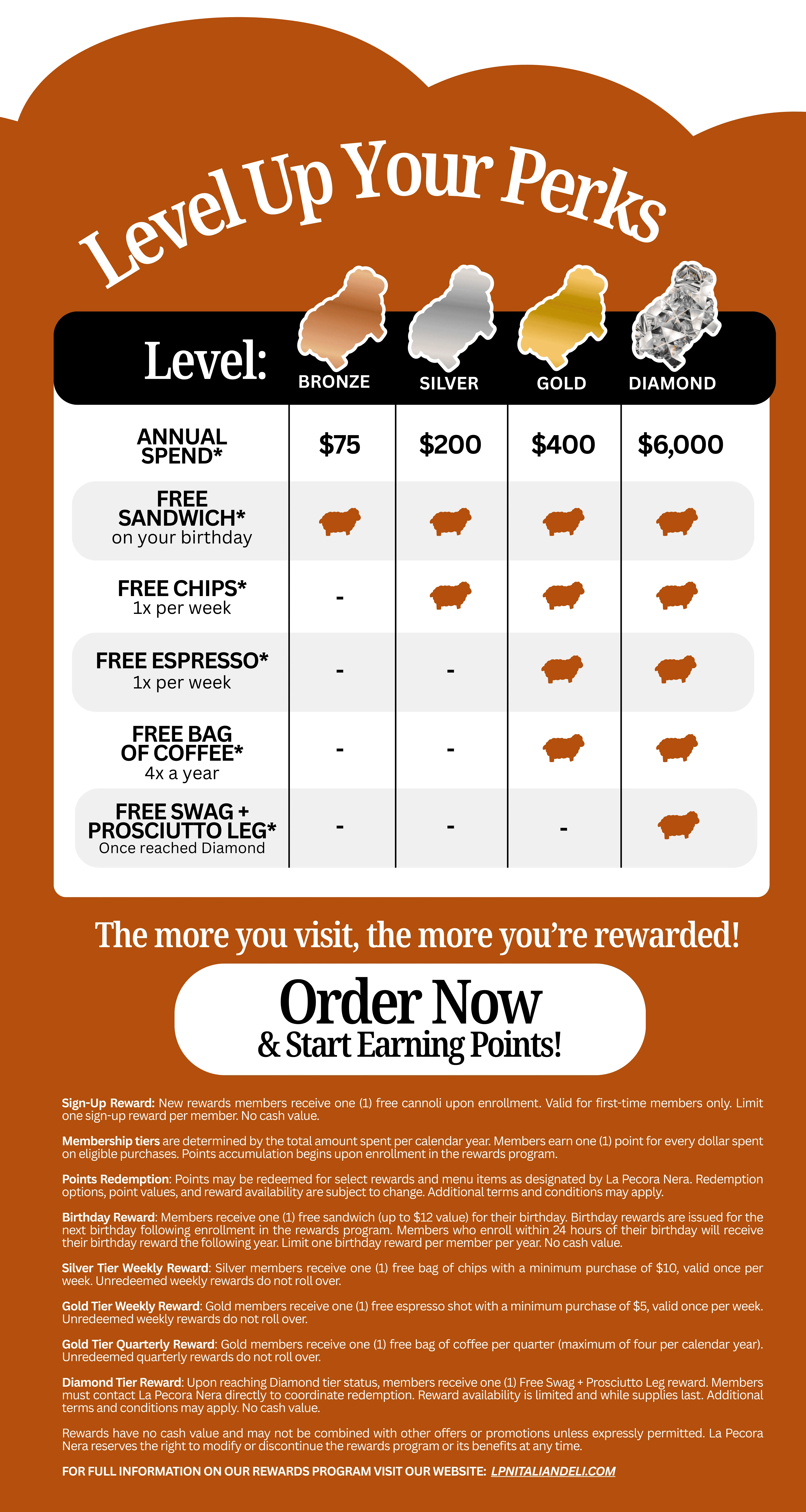 Earn one point for every $1 that you spend. Every order counts towards your total.